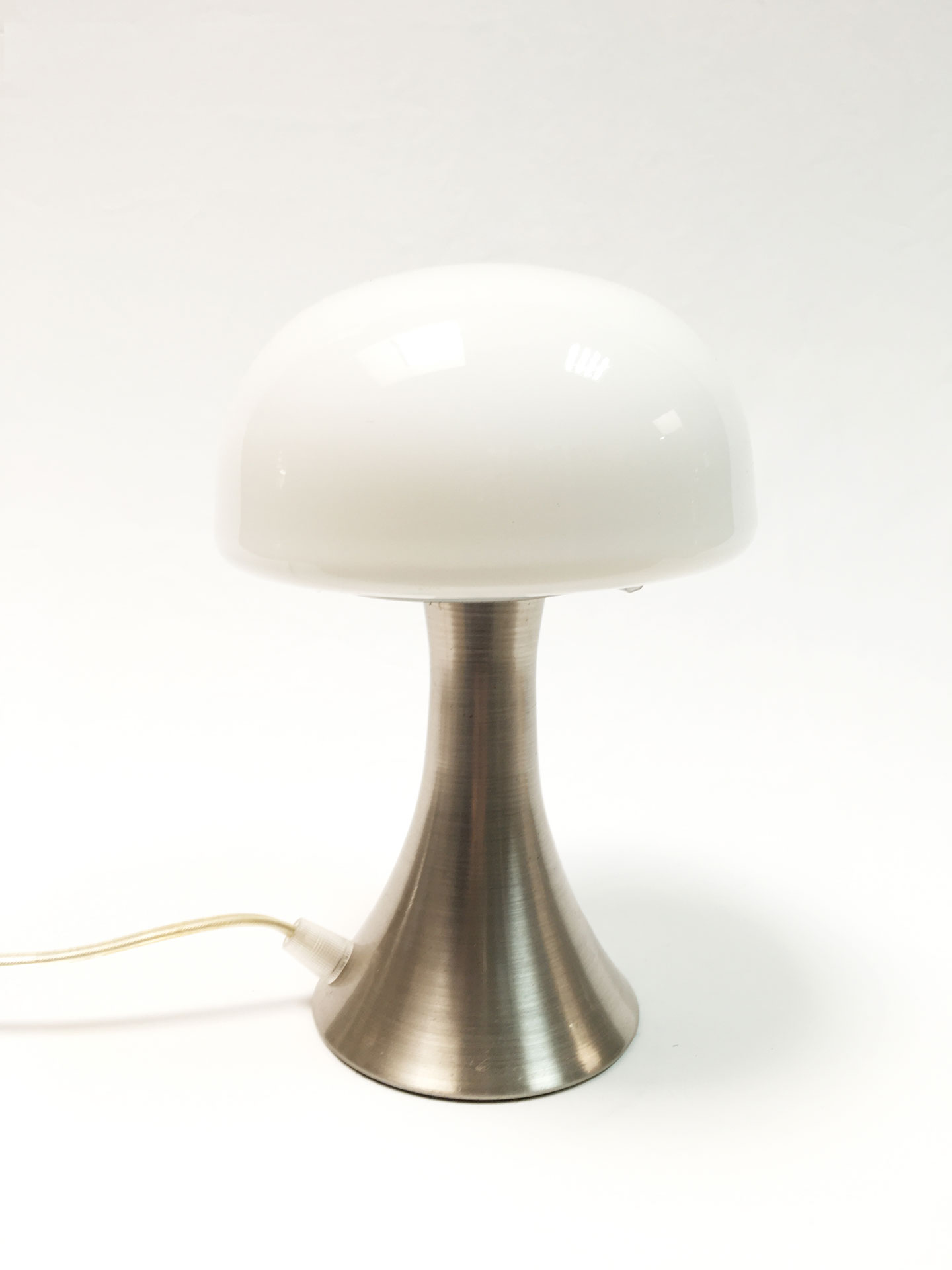 Candeeiro de mesa com base em metal escovado e globo de vidro. Dimensões: 13 cm x 10 cm (A x L); Globo: 15 cm (D)Estado: Bom estadoExemplares: 1