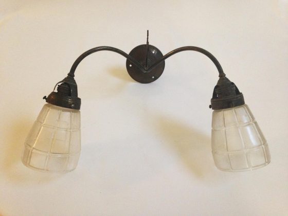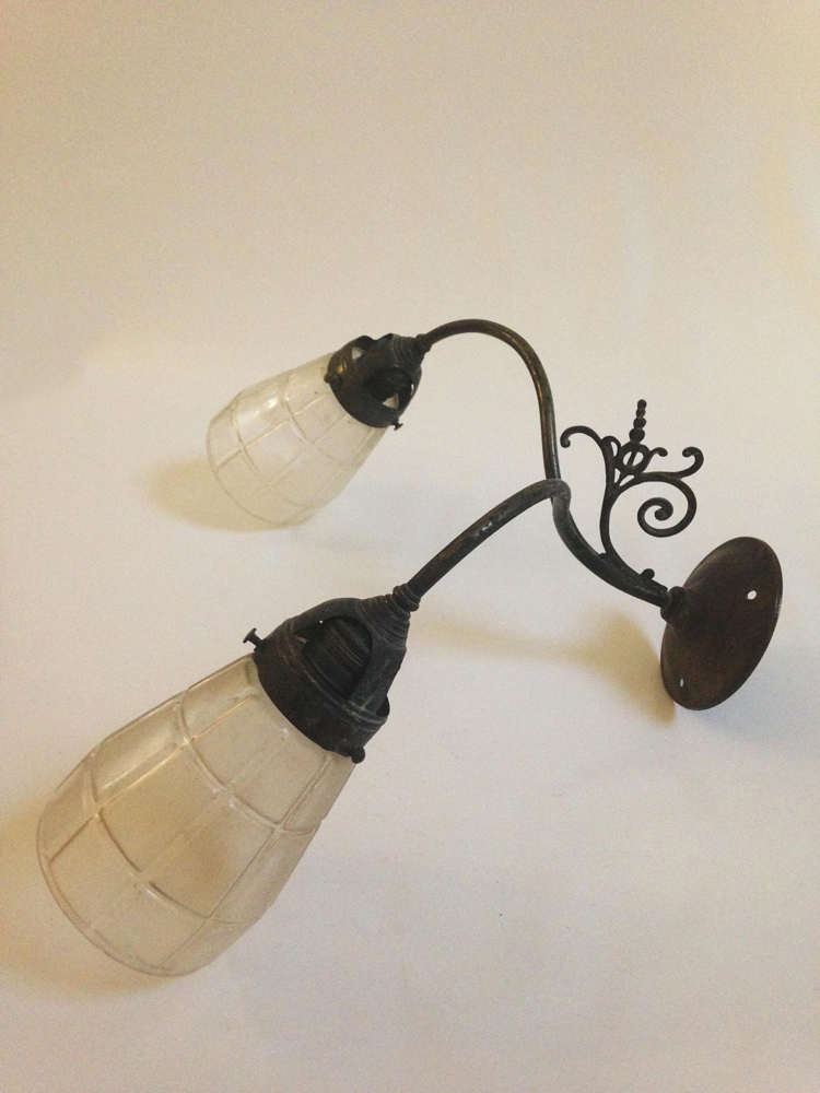 Candeeiro de metal com 2 tulipas de vidro fosco. Dimensões: 32x37x26 cm (AxLxP); Globo 10 cmEstado: Com imperfeiçõesExemplares: 1 Décadas anteriores a 1950